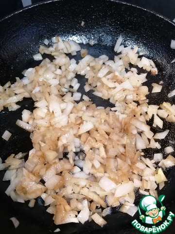 Очистить лук, порезать на кубики. Бросить в сковороду.