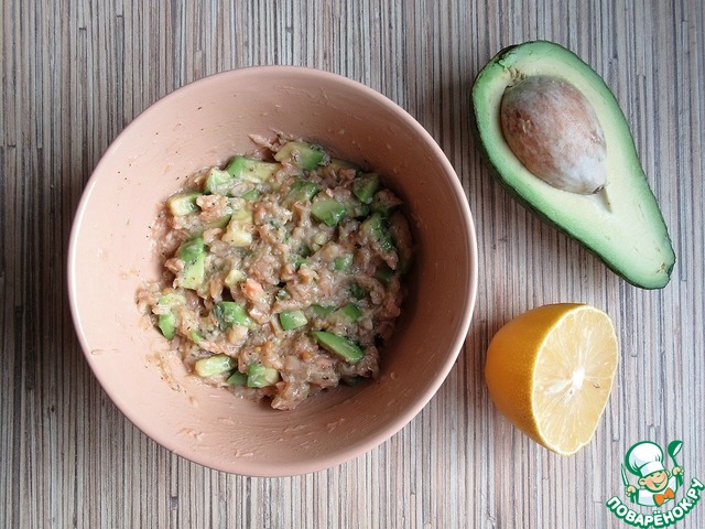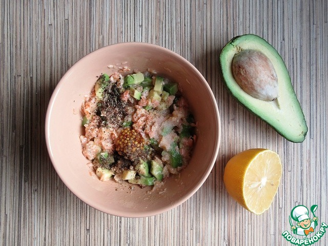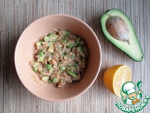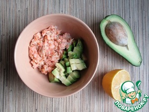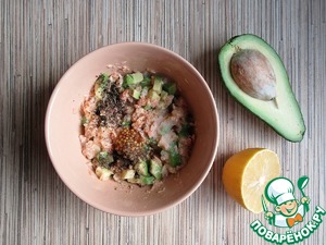 Отварную семгу разомните вилкой, добавьте нарезанный кубиками авокадо, сразу полейте лимонным соком, чтобы авокадо не потемнело. Перемешайте.