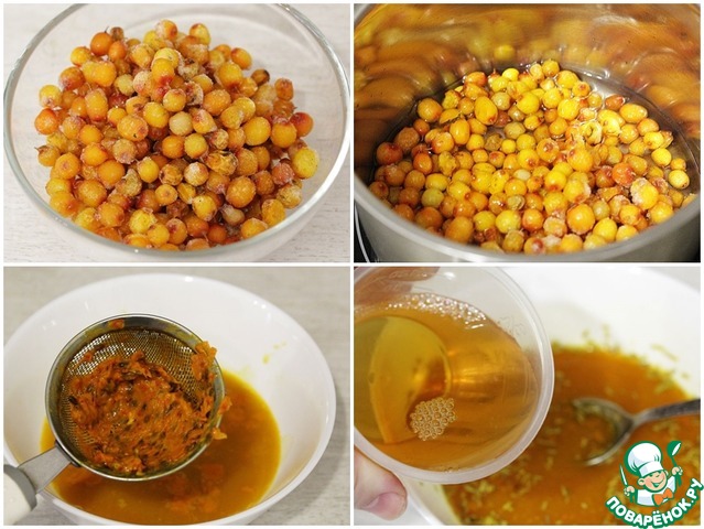 Облепиху выложить в маленькую кастрюльку, влить к ней 3 ст. л. воды, поставить на огонь и довести до кипения. Прогреть буквально 30 секунд, после чего отвар слить в небольшую миску, туда же протереть ягоды. Жмых выбросить или заварить с ним чай.