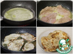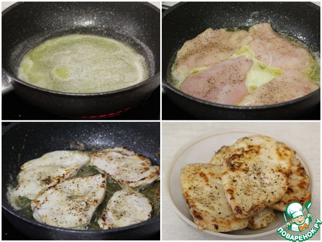 В сковороде на среднем огне разогреть сливочное и растительное масло и обжарить на куриное филе с обеих сторон до румянца, после чего переложить из сковороды на блюдо.