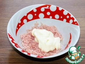 2. К ветчине добавляем плавленный сыр (1 ст. л.) и майонез (1-2 ст. л.).