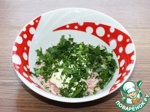3. Мелко рубим листья петрушки и добавляем в миску, перемешиваем.