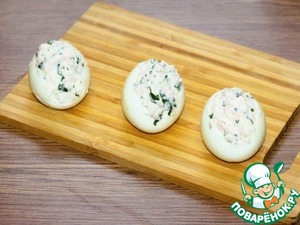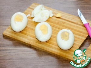 4. Отваренные яйца охлаждаем, очищаем и надрезаем белок, 1/4 часть или как на фото.