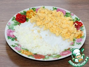6. Желток измельчаем вилкой. Срезанный белок 1/4 часть, натираем на мелкой терке.