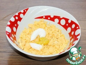 9. Желток смешиваем с майонезом (1-2 ст. л.) и горчицей (1 ч. л.).