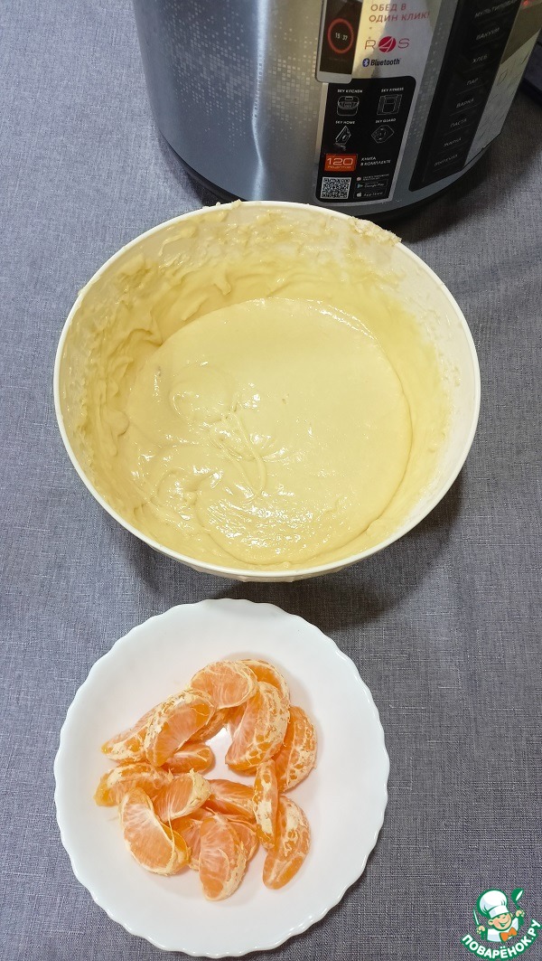 Смазываем чашу масло (уйдет примерно 5гр) и отправляем в чашу полученное тесто 70-80%, далее слой мандаринов, далее оставшееся тесто — Режим «Выпечка» 60 минут.