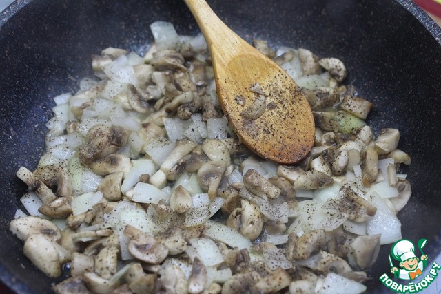 Если нет отварной моркови, порезать сырую и добавить к луку и грибам. -