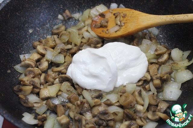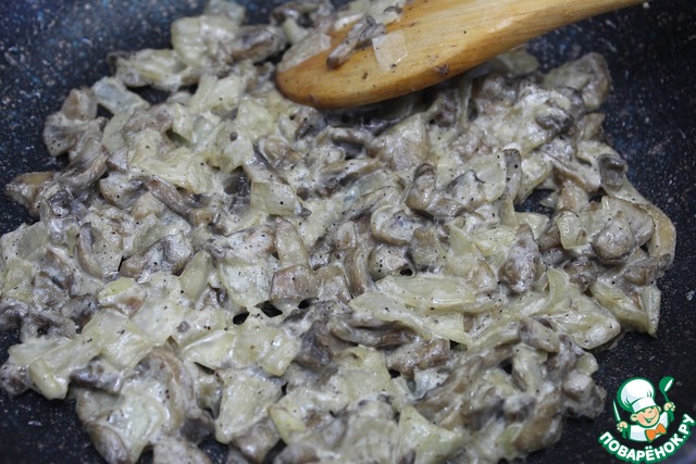 Добавить сметану и тушить, пока испарится практически вся жидкость и масса загустеет. -