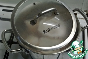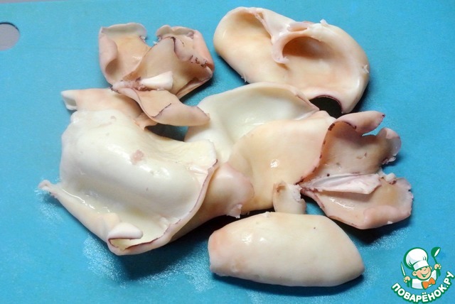 Кальмары разморозить в воде, очистить, промыть. Отварить в кипящей подсоленной воде. Кальмары варила в кастрюле из нержавеющей стали 3л со стеклянной крышкой, линия "Leon" Арт. LN-CA3020G ТМ KUKMARA.