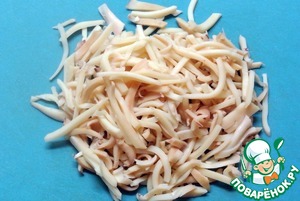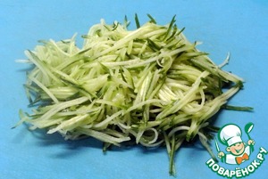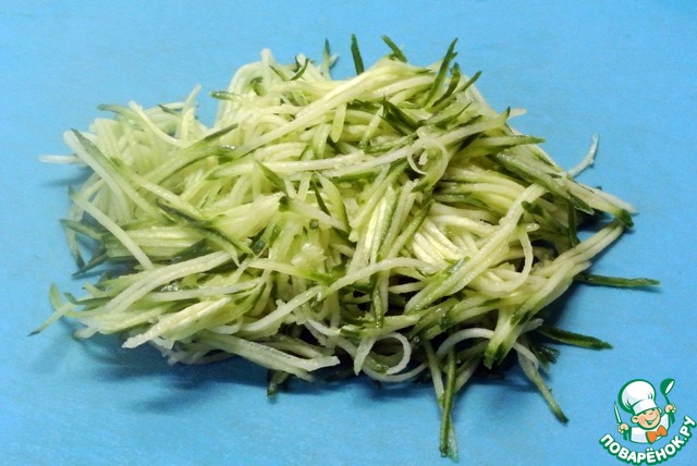 Свежий огурец нашинковать соломкой. Я натерла на терке для моркови по-корейски.