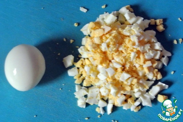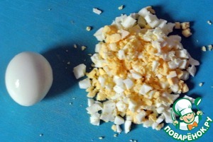 Яйца отварить, очистить, дать остыть, и мелко нарезать кубиками.