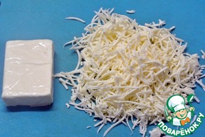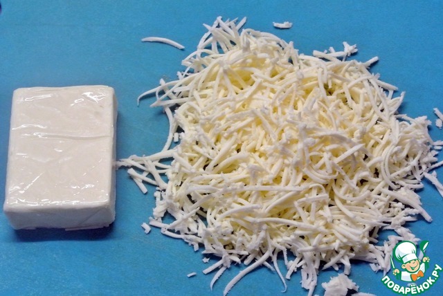 Плавленый сыр натереть на крупной терке. Я натерла на терке для моркови по-корейски.