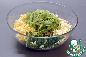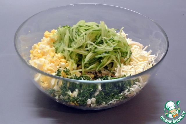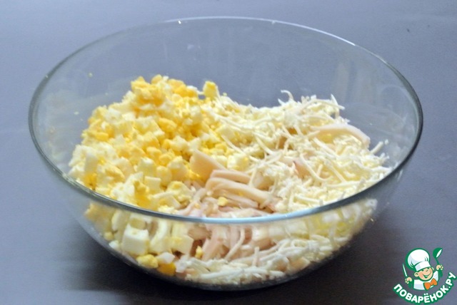 Нарезанные кальмары, яйца и тертый плавленный сыр выложить в салатник.