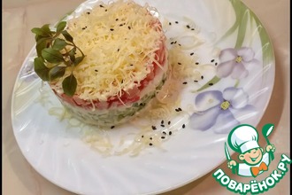 Очень симпатичный салат для любителей морепродуктов. Что-то я увлеклась курицей, овощами, рыбкой, а про кальмаров совсем забыла)))