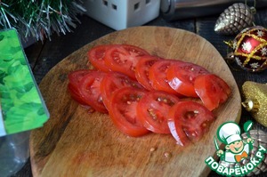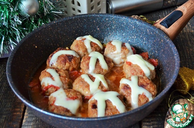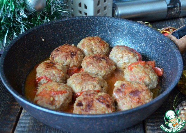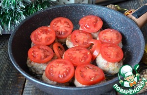 Выложить все обжаренные тефтели в сковороду, разложить дольки помидоров. Накрыть крышкой и томить на медленном огне 10 минут.