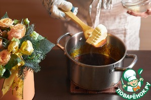 Полностью растопить сахар, помешивая деревянной лопаткой. Влить в карамель 175 мл крутого кипятка. Острожно! Наденьте перчатку и не наклоняйтесь над кастрюлей!