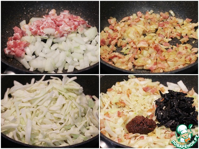 В ту же сковороду выложить лук и бекон и обжарить все вместе до румяности.