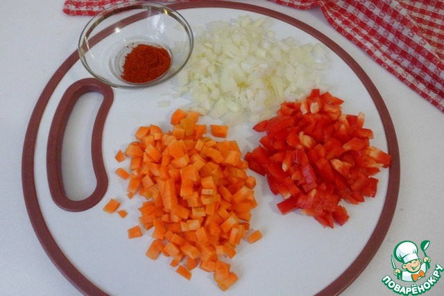 Мелко нарезаем луковицу. Морковь, болгарский перец и помидор нарезаем кубиком.