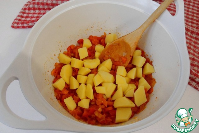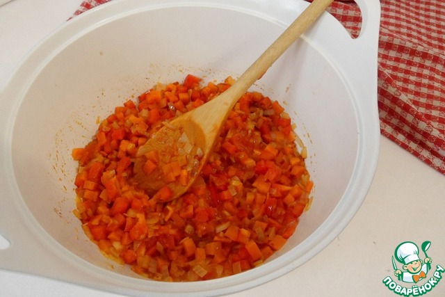 В кастрюле с толстым дном разогреваем сливочное масло и обжариваем лук, морковь и болгарский перец до смягчения овощей. Затем добавляем нарезанный помидор и паприку, тушим все вместе еще 2-3 минуты.