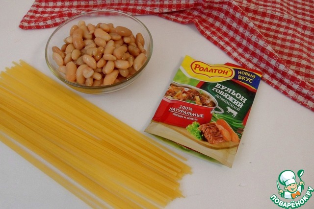 Из банки с консервированной фасолью слить жидкость. Промывать фасоль не нужно. Лапшу лучше взять широкую.