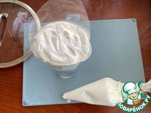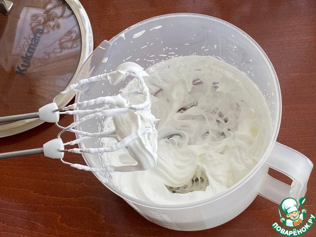 Затем продолжайте взбивать белковую массу и тонкой струйкой влейте фруктовый сироп.