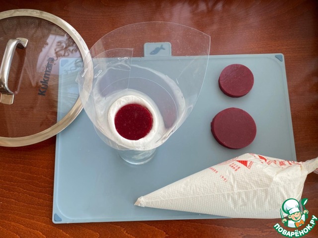 Форму для основы елочки, установите в стакане и отсадите немного зефирной массы. Затем поместите небольшой кружок вишневого мармелада.