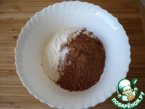 Подготовим сухую смесь, в миску просееваем пшеничную муку, добавляем какао-порошок и щепотку соли. Все перемешать до однородного состояния.