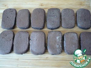 Остывшие коржи обрезать по краям. Получилось 12 брусочков (обрезки потом измельчим в крошку и украсим ею торт).