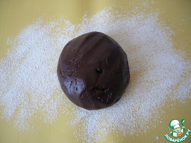 Тесто получается мягкое, эластичное, забивать тесто мукой не надо. Посыпаем рабочую поверхность мукой и перекладываем на нее тесто.