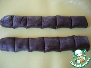 Из теста сформируйте две "колбаски". Каждую "колбаску" разделите приблезительно на 6 кусочков.