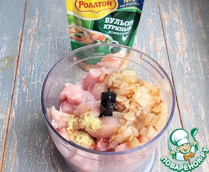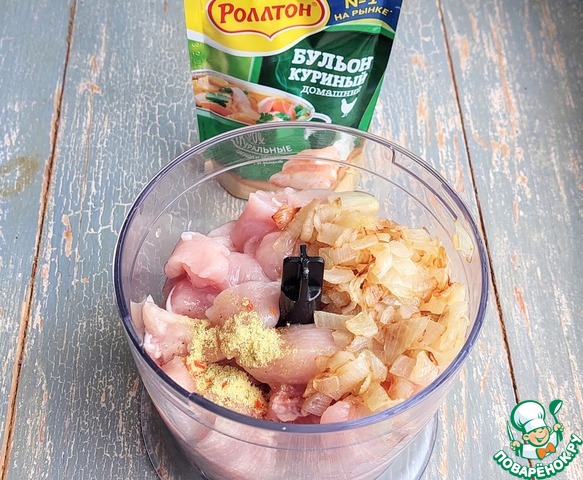 В блендер поместить нарезанное куриное филе, обжаренные лук, чеснок и 1/2 ч. л сухого куриного бульона "Роллтон".