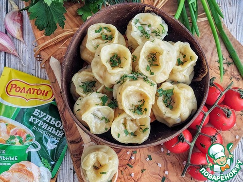 Для тех кто любит готовить домашние пельмешки, предлагаю рецепт теста, где в качестве основного ингредиента используется бульон. Я буду использовать куриный бульон "Роллтон". Тесто тонко раскатываться, не рвется при лепке и держит форму при варке. Пельмени я буду лепить в виде мешочков, с начинкой из куриного филе и лука. Угощайтесь!