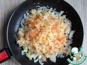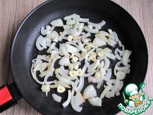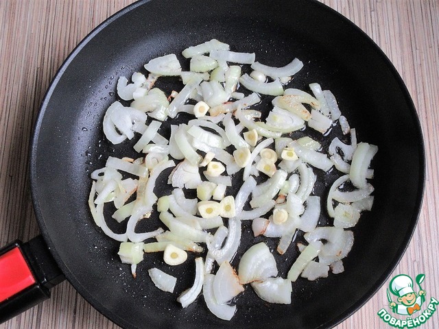 Лук и чеснок произвольно нарежьте, обжарьте на растительном масле.