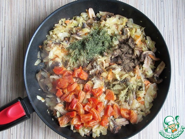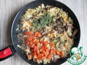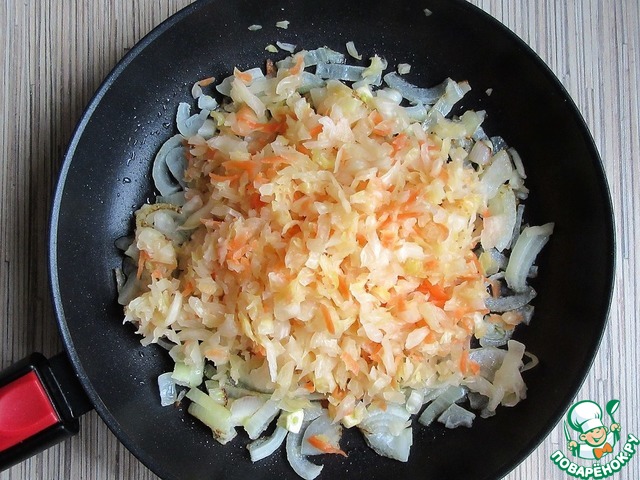 Добавьте отжатую квашеную капусту (можно взять пополам со свежей), обжарьте пару минут. Курагу замочите на 5 минут в теплой воде.