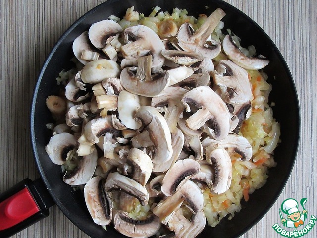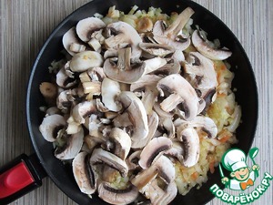 Добавьте шампиньоны, нарезанные пластинами, обжарьте еще 5 минут.