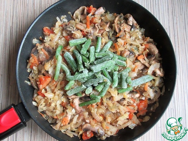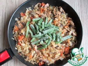 Добавьте стручковую фасоль, перемешайте. Через 5-7 минут снимите с огня.