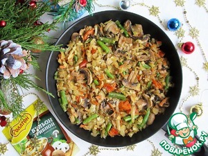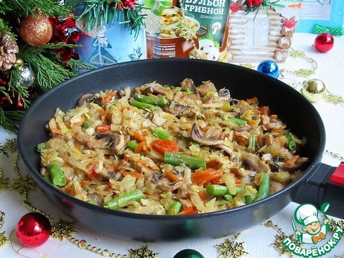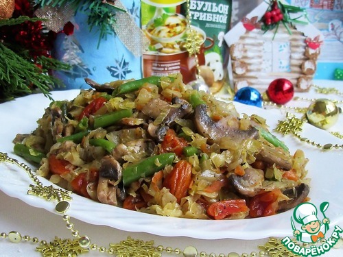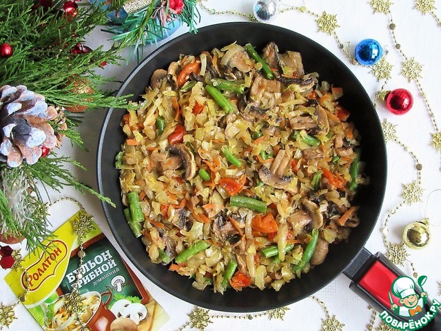 Бигос - традиционное блюдо белорусской, литовской, украинской и польской кухни из капусты и мяса. Но есть еще и постный вариант этого блюда, который готовится на Рождественский сочельник. Обязательные ингредиенты, конечно же, капуста и грибы, остальные компоненты на вкус и предпочтение хозяйки. Попробуйте мой вариант с курагой и стручковой фасолью, а также с ароматным грибным бульоном ТМ Роллтон, который достойно подчеркивает вкус блюда!
