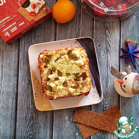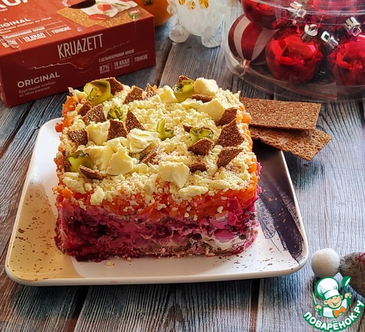 Вкусный и красивый слоёный салат на праздничный и будний стол. Отсутствие картофеля делает этот салат нетяжелым, а присутствие ржаных хлебцев Kruasett добавляет разнообразия во вкусе и текстуре.