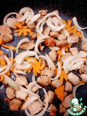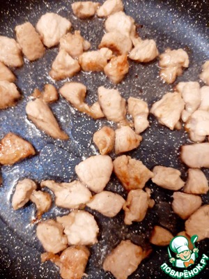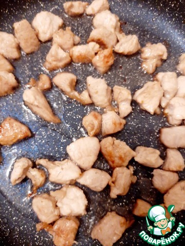 Индейку режем на кусочки и обжариваем до золотистого цвета.