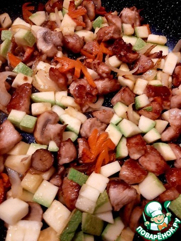 Затем добавить шампиньоны, обжарить и добавить кабачок порезанный кубиками. Обжарить до золотистого цвета. Добавить 3ст. л соевого соуса.