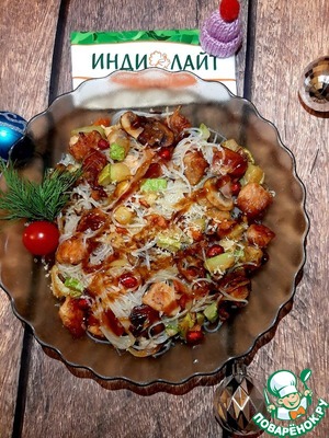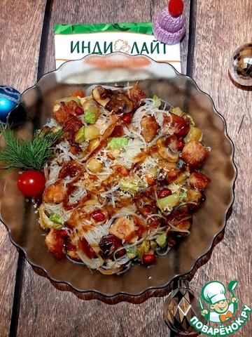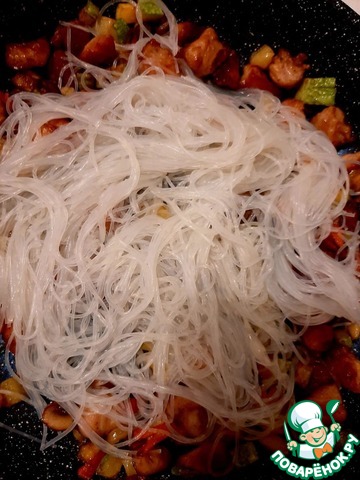 Фунчозу залить кипятком на 5 мин. Слить воду и добавить ее к индейке. Перемешать, посолить по-вкусу.