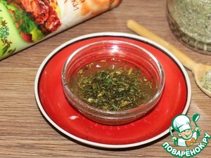 4. Приготовим маринад. Смешиваем 3 ст. л. растительного масла с приправой для мяса, пряной зеленью и прессованным чесноком, солим и перчим.