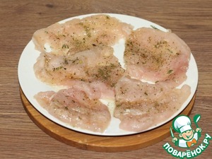 1. Подготовим филе индейки. Нарезаем мясо пластинами.