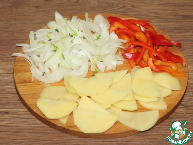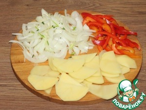 6. Подготовим овощи. Очищаем и нарезаем: лук - полукольцами, перец сладкий - соломкой, картофель - половинками и помидор небольшими дольками.
