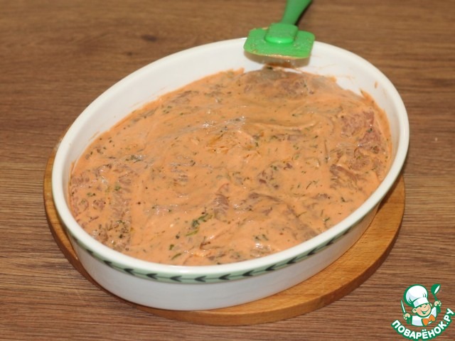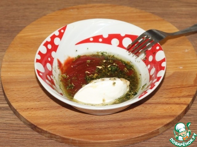 10. Приготовим соус. Сметану, смешиваем с томатной пастой (или кетчупом) и остатками маринада.