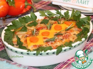 Нежное и сочное филе индейки с овощами. Блюдо запекалось под пряным соусом и под сырной шубкой.