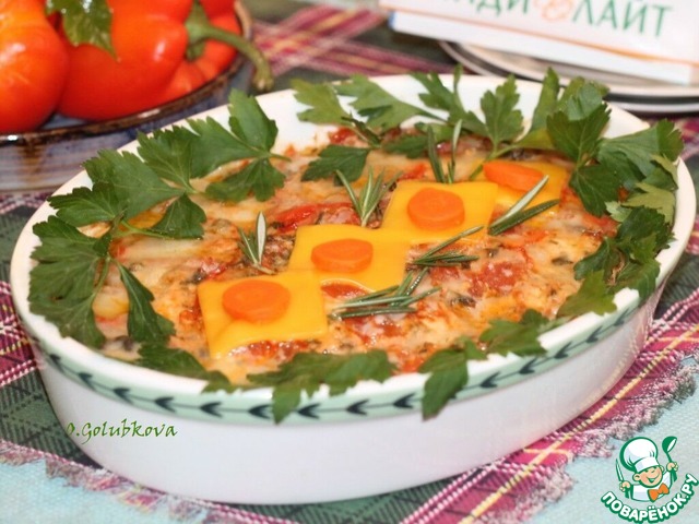 15. Затем снимаем фольгу, украшаем блюдо тертым и пластинчатым плавленным сыром. Ставим форму в духовку до расплавления сыра, минуты на 2.