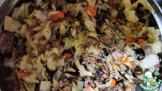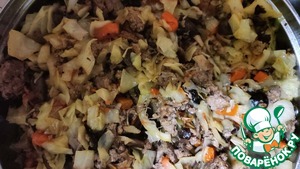 Обжариваем лук с морковью 5 минут на сильном огне, добавляем фарш и продолжаем жарку еще 15 минут. Заливаем кипятком древесные грибы из пачки, режем капусту и эноки и, пока вешенки разбухают, обжариваем с фаршем.