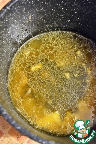 Нагреть желатин, постоянно помешивая. Добавить оставшийся бульон. Желатин должен полностью раствориться.