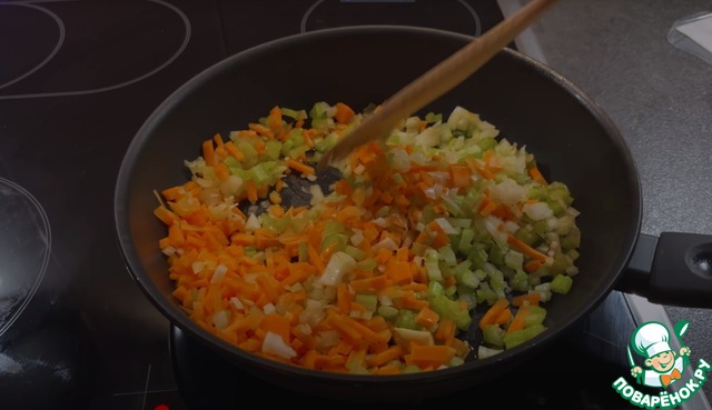 Порезать лук, морковь, селдерей, смешать и добавить чеснок. Выложить смесь на сковородку, политую маслом, посолить, и обжаривать на среднем огне до прозрачности лука. Переложить смесь в тарелку.